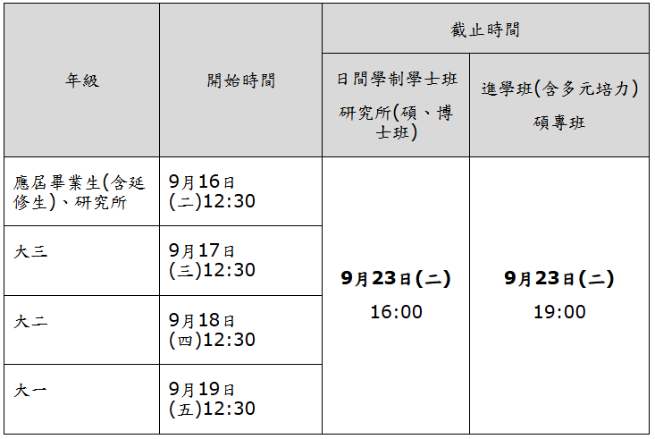 (二)系統開放日期:9月16日(二)至9月23日(二),依年級開放
