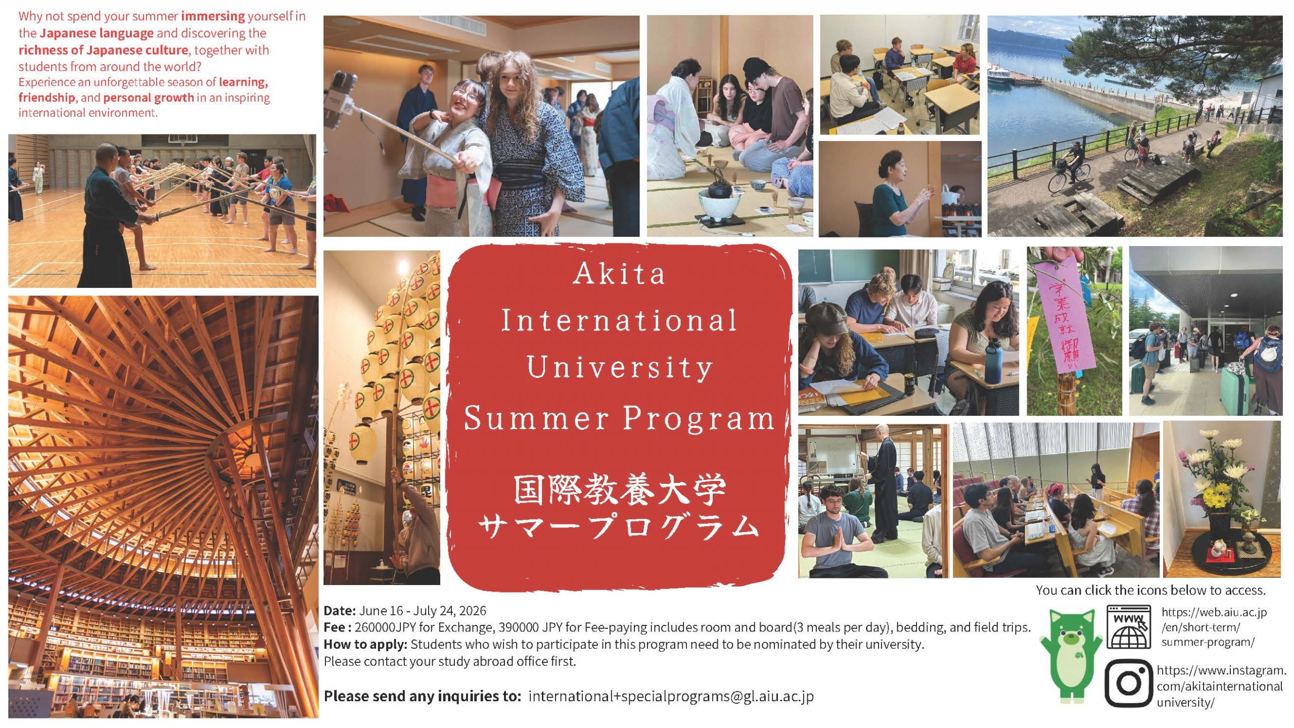 (三)活動費用:39萬日幣(費用含學費、手續費、住宿、餐費等,詳情依活動官網公告為主:https://web.aiu.ac.jp/en/sp/su/overview/