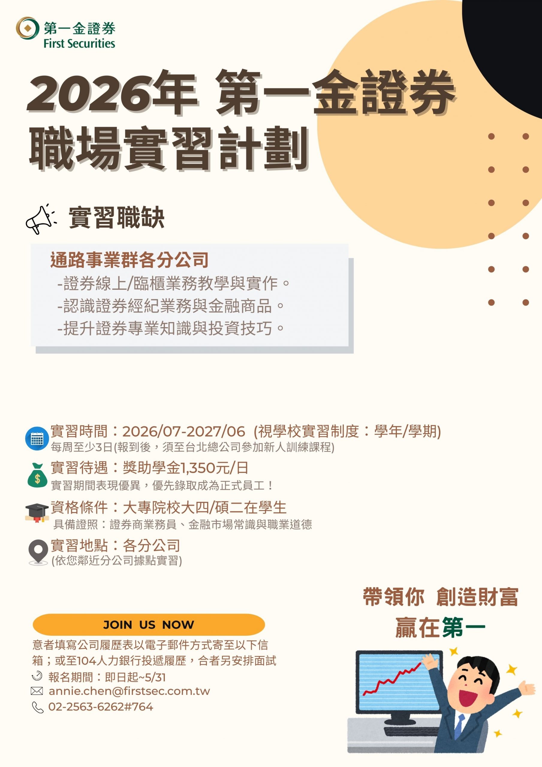■ 實習時間:2026/07-2027/06,每週至少3日。(報到後需至台北總公司參加新人訓練課程)