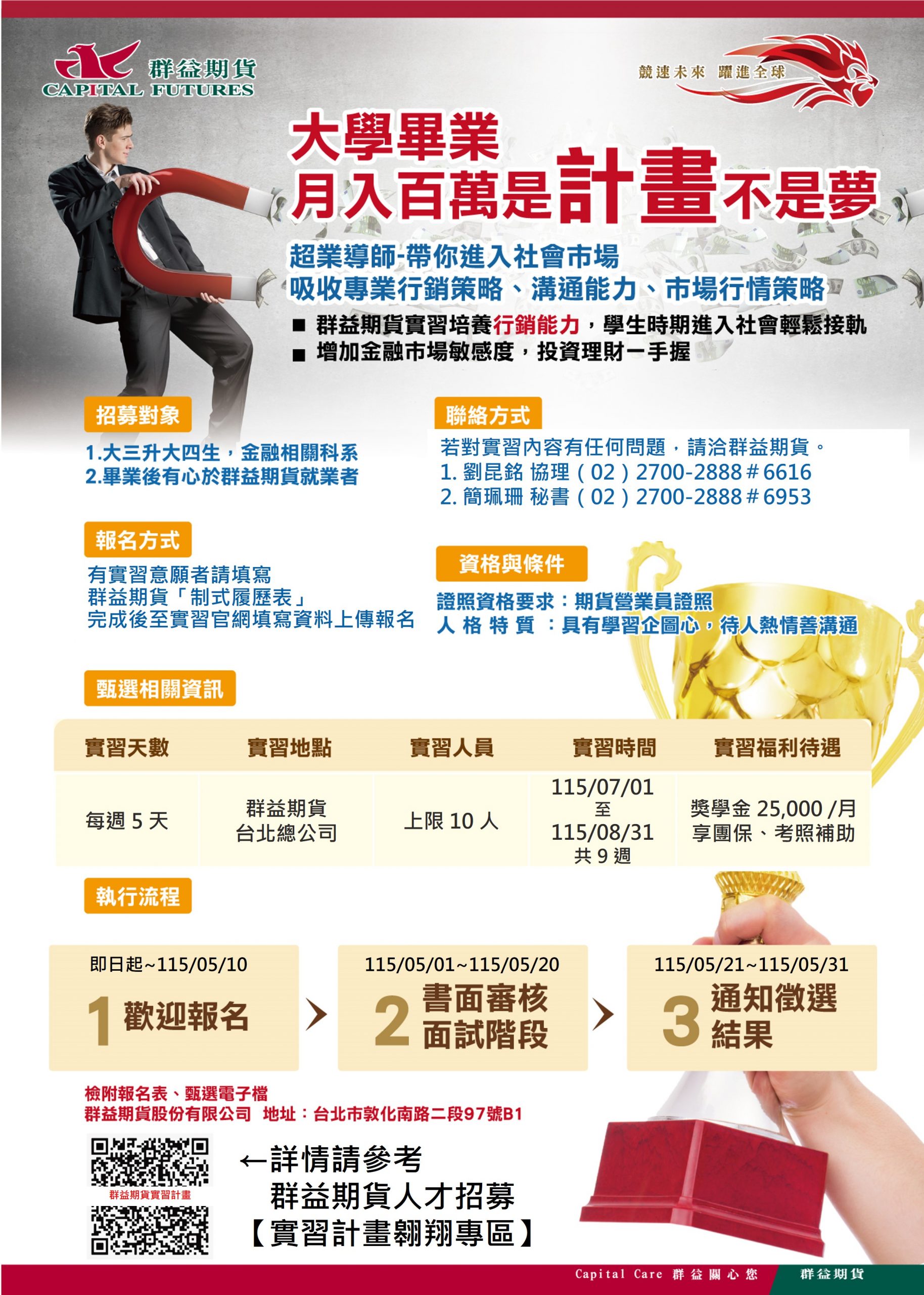 ■ 申請方式:5/10(日)前填寫實習生履歷表,並上傳至實習官網:https://activity.capitalfutures.com.tw/Recruit/Intern/Plan(官網已開放履歷投遞)
