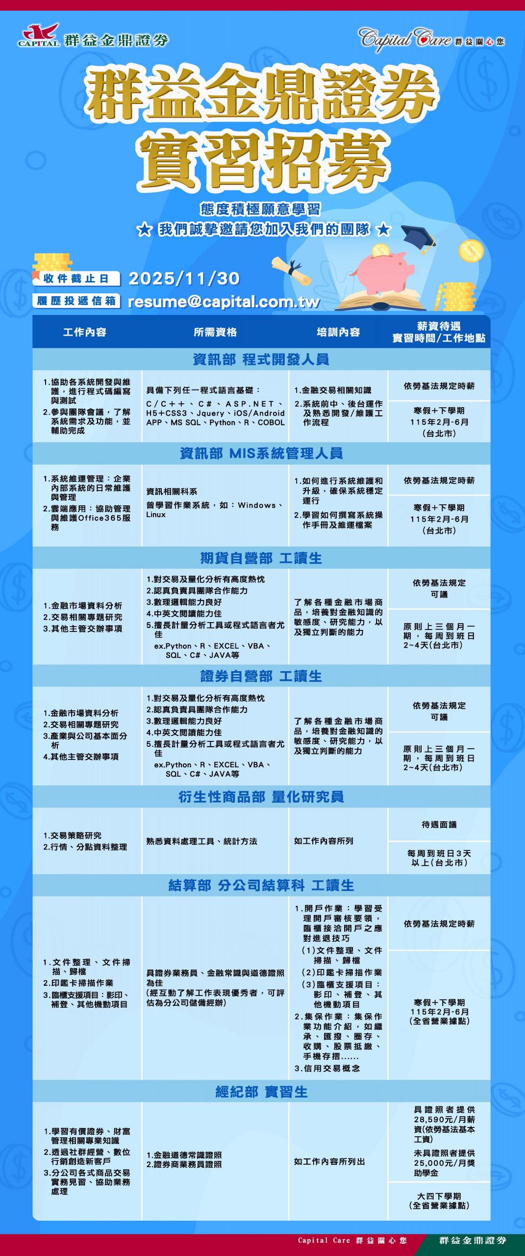 ■ 申請方式:12/12(五)17:00前填寫 群益金鼎證券制式履歷表 ,寄送至tlbx@oa.tku.edu.tw。(收件截止日及方式請以此公告為準)