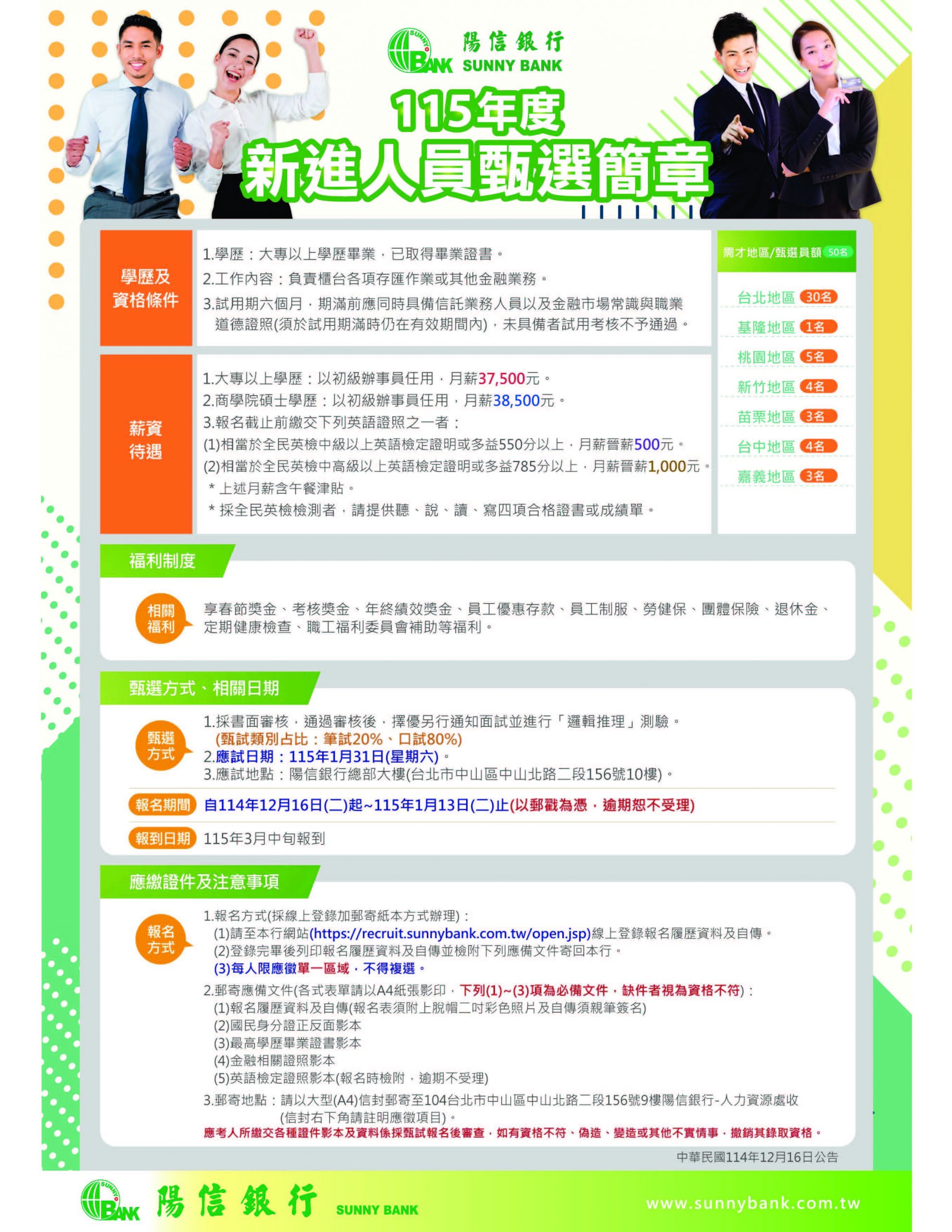■ 甄試相關連結請洽陽信商業銀行人才招募網站:https://recruit.sunnybank.com.tw/open.jsp。