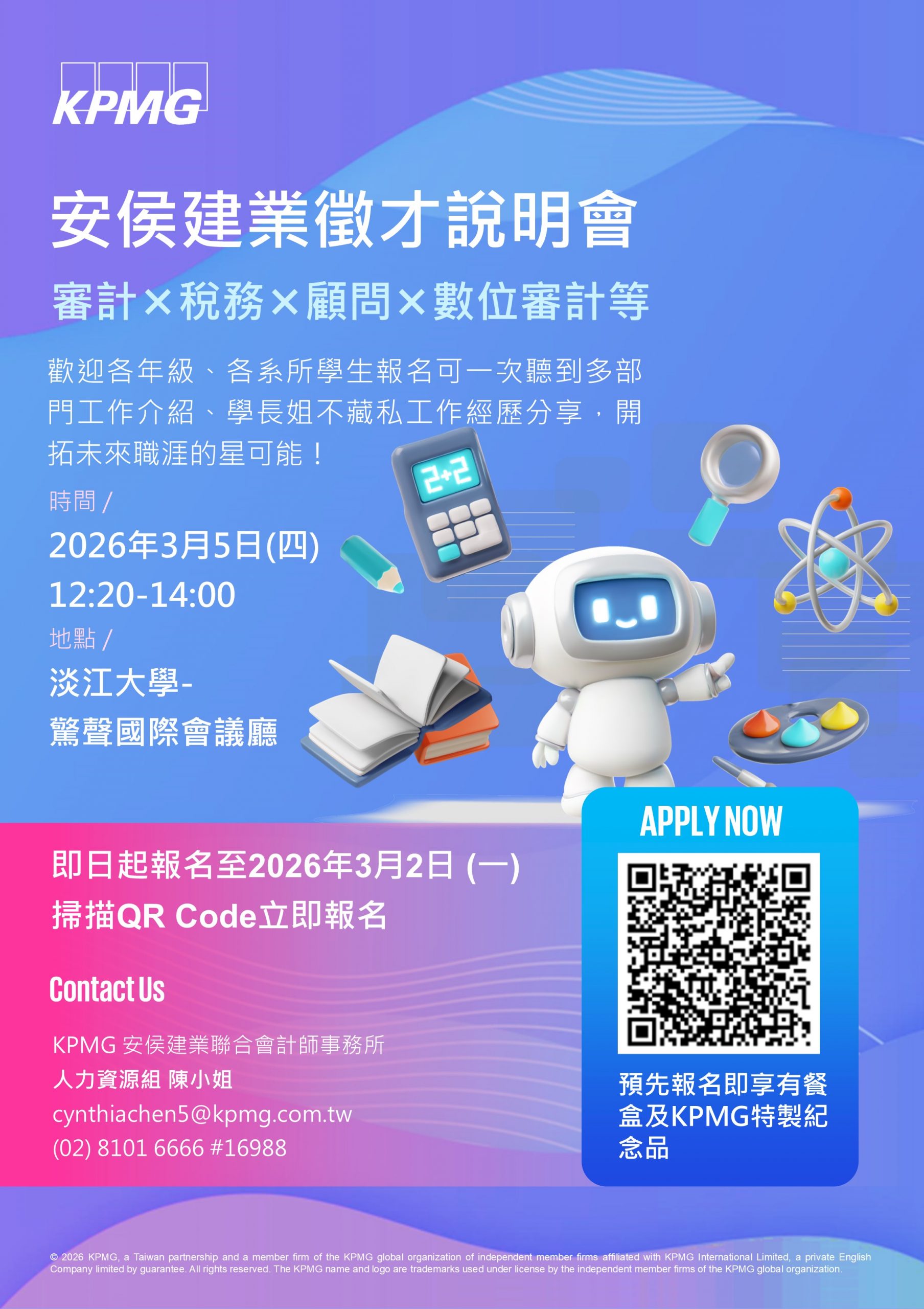 KPMG特邀請審計部、稅務部及顧問部合夥人及同仁,為各位同學進行審計、稅務及顧問工作介紹,同時邀請學長姊跟各位零距離分享工作經驗喔!